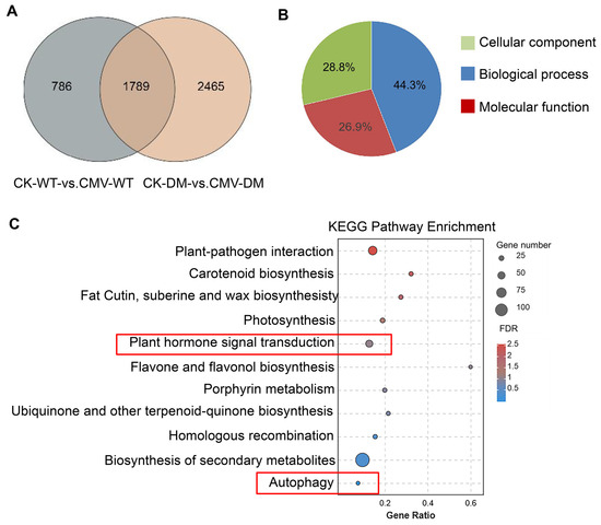 Gene expression patterns and KEGG enrichment analyses for CK-WT vs. CMV-WT and CK-DM vs. CMV-DM groups. (A) Venn diagram of DEGs identified in CK-WT vs. CMV-WT and CK-DM vs. CMV-DM groups. CK, control plant; CMV, plant inoculated with CMV; DM, 14-3-3λ/κ double-mutant plant. (B) GO enrichment analysis of DEGs. Different colors represent different functional categories. (C) KEGG enrichment plot for DEGs in CK-WT vs. CMV-WT and CK-DM vs. CMV-DM groups. Enrichment significance was measured by the Rich factor, FDR value, and the number of genes enriched in the pathway. The Rich factor refers to the ratio of enriched differentially expressed genes in a pathway to total annotated differentially expressed genes. Higher values indicate greater enrichment. FDR values are in the range of 0–1; values closer to 0 indicate greater significance. KEGG, Kyoto Encyclopedia of Genes and Genomes.