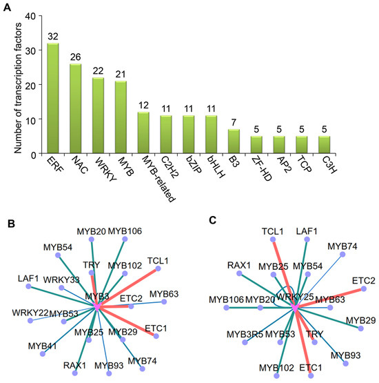 Analyses of differentially expressed transcription factors (TFs) in WT and 14-3-3λ/κ double-mutant plants upon CMV infection for 15 days. (A) Classification of differentially expressed TFs (top 13). (B,C) Targeting analysis of MYB3 (B) and WRKY25 (C).