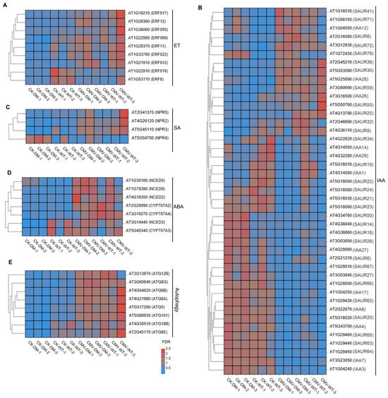 14-3-3 proteins coordinate phytohormones and autophagy signaling pathways to regulate CMV infection in Arabidopsis. Heatmap of DEGs in WT and 14-3-3λ/κ double-mutant plants under normal growth conditions (CK) or infected with CMV for 15 days (CMV) for ET (A), IAA (B), SA (C), ABA (D), and autophagy (E) pathways. ET, ethylene; SA, salicylic acid; ABA, abscisic acid; IAA, indole-3-acetic acid.
