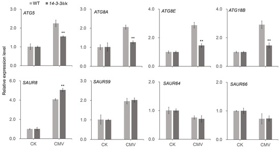 Expression analysis of autophagy-related and IAA-responsive genes. Relative expression levels of selected genes in the autophagy pathway (ATG5, ATG8A, ATG8E, ATG18B) and IAA signaling (SAUR8, SAUR59, SAUR64, SAUR66) in the WT and 14-3-3λ/κ double-mutant plants under normal growth conditions (CK) or infected with CMV for 15 days (CMV). Data represent the mean ± SD (n = 3 biological replicates). Asterisks indicate statistically significant differences compared to the WT (** p < 0.01; Student’s t-test).