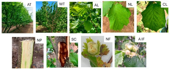 Hazelnut plant material exhibiting different symptoms. AT: asymptomatic trees; WT: wilted twigs; AL: asymptomatic leaves; NL: leaves with necrotic spots; CL: leaves with chlorotic spots; NP: portions of necrotic phloem; SC: stem canker; NF: necrotic fruit; AIF: asymptomatic involucres and fruit.
