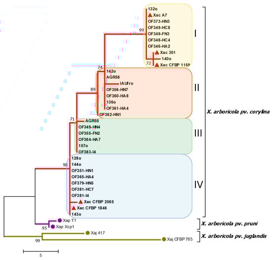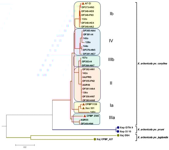 To further analyze the diversity of the 29 X. arboricola pv. corylina isolates, whole-genome sequencing was used (Figure 3 and Figure S5).
