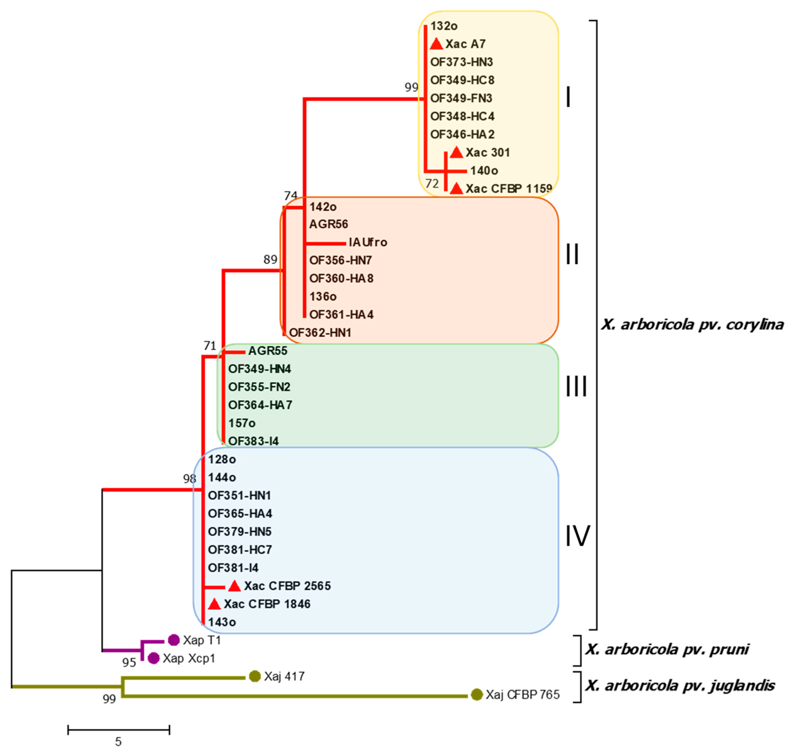 - Fischer-Le Saux, M.; Bonneau, S.; Essakhi, S.; Manceau, C.; Jacquesa, M.A. Aggressive emerging pathovars of Xanthomonas arboricola represent widespread epidemic clones distinct from poorly pathogenic strains, as revealed by multilocus sequence typing. Appl. Environ. Microbiol. 2015, 81, 4651–4668. [Google Scholar] [CrossRef]