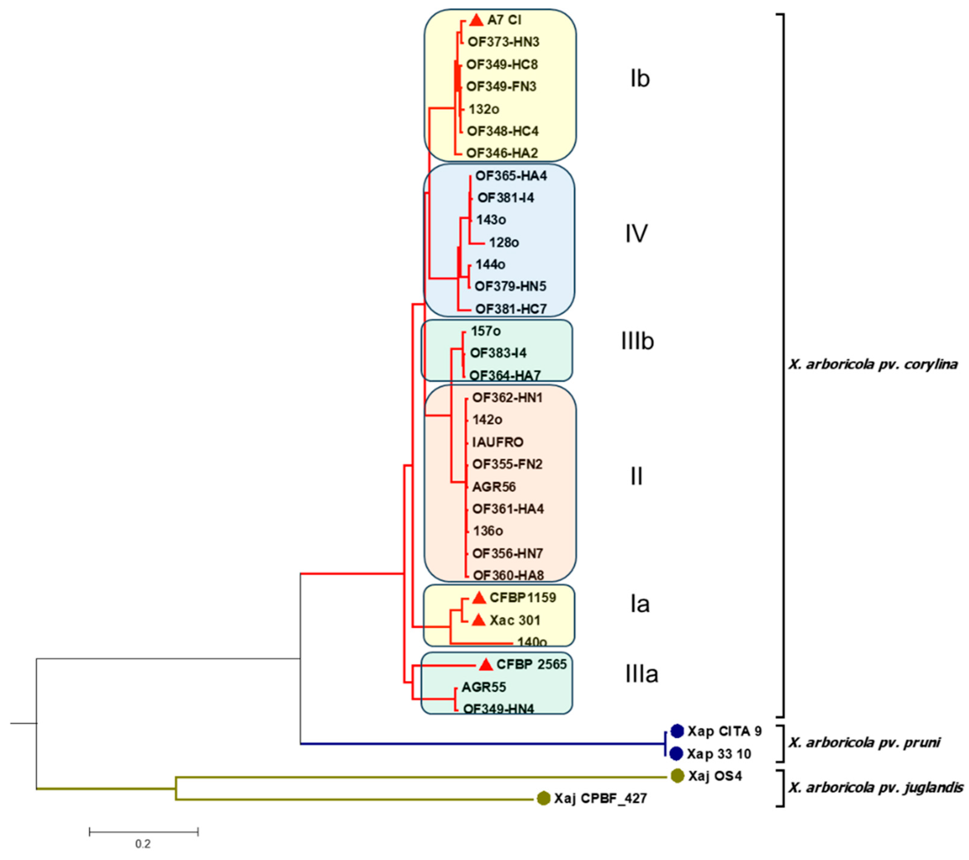 - Kałużna, M.; Fischer-Le Saux, M.; Pothier, J.F.; Jacques, M.A.; Obradović, A.; Tavares, F.; Stefani, E. Xanthomonas arboricola pv. juglandis and pv. corylina: Brothers or distant relatives? Genetic clues, epidemiology, and insights for disease management. Mol. Plant Pathol. 2021, 22, 1481–1499. [Google Scholar] [CrossRef]