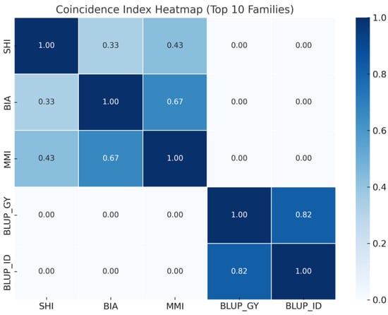 Heatmap shows the coincidence index among five selection methods—BIA (Base Index Approach), SHI (Smith–Hazel Index), MMI (Mulamba–Mock Index), BLUP_GY (REML/BLUP for Grain Yield), and BLUP_ID (REML/BLUP for Inbreeding Depression)—based on the top 10 most frequently selected maize progenies. Values represent the proportion of progenies jointly selected by each pair of methods.