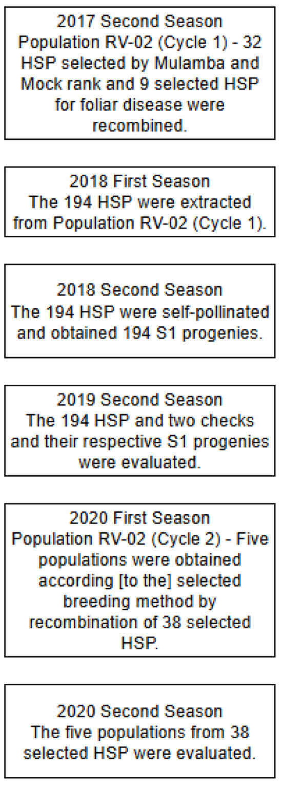 In 2018, in the first season, 194 HSP were extracted from Population RV-02 (Cycle 1), and in the second season, the 194 HSP were self-pollinated and obtained 194 S1 progenies.