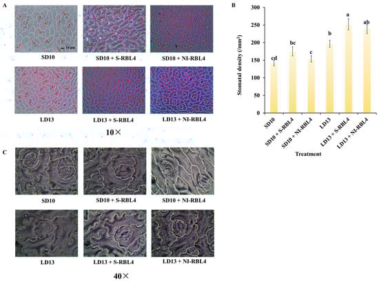 Stomata are specialized structures in the plant epidermis, primarily on leaf surfaces. This study showed that photoperiod combined with S-RBL4 and NI-RBL4 treatments distinctly affected stomatal density and aperture in chrysanthemum leaves (Figure 4). Stomatal density on the lower epidermis was significantly higher under LD13 than SD10 conditions. Under both SD10 and LD13 conditions, S-RBL4 and NI-RBL4 treatments increased stomatal density, with S-RBL4 having a stronger effect. The highest density occurred with LD13 + S-RBL4, which was 77.46% greater than the SD10 treatment (Figure 4A,B). High-magnification microscopy revealed that both RBL4 variants increased stomatal aperture compared to controls, with S-RBL4 showing the greatest enhancement. As shown in Figure 4C, LD13 + S-RBL4 produced the widest stomatal opening.