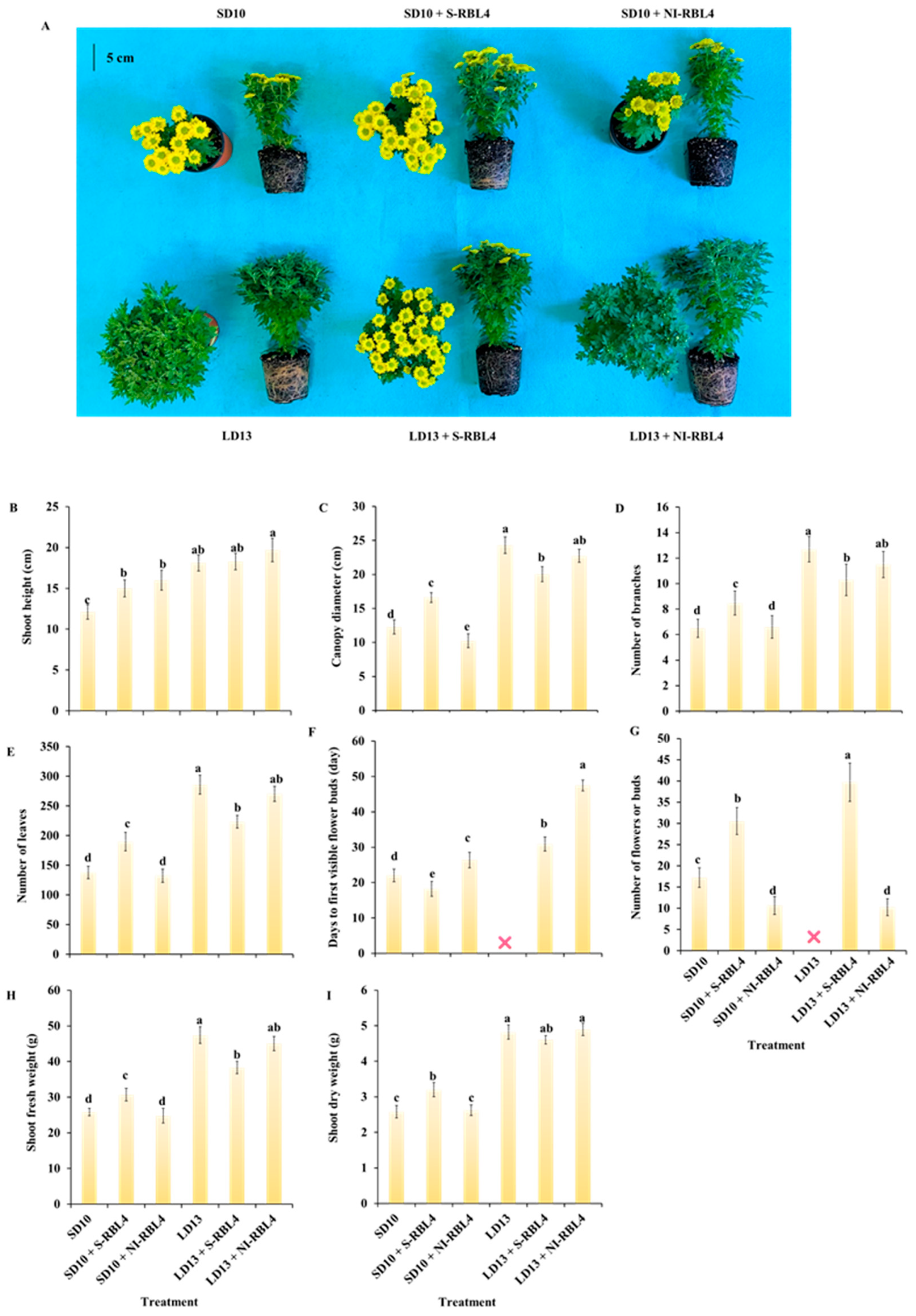 - Park, Y.G.; Muneer, S.; Jeong, B.R. Morphogenesis, flowering, and gene expression of Dendranthema grandiflorum in response to shift in light quality of night interruption. Int. J. Mol. Sci. 2015, 16, 16497–16513. [Google Scholar] [CrossRef] [PubMed]