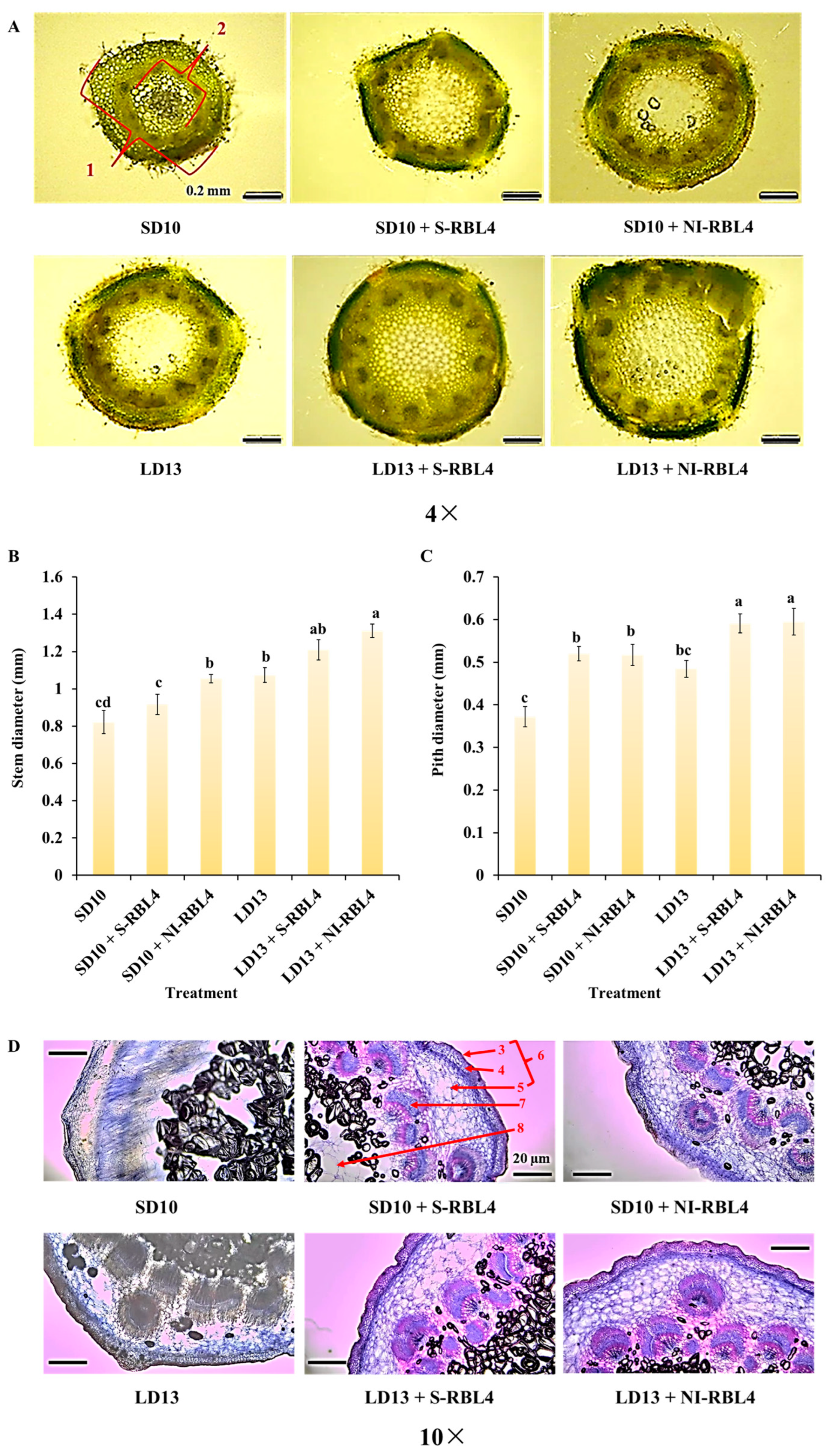 4.4. Microscopic Observation of Stem Cross Sections and Stomatal Traits