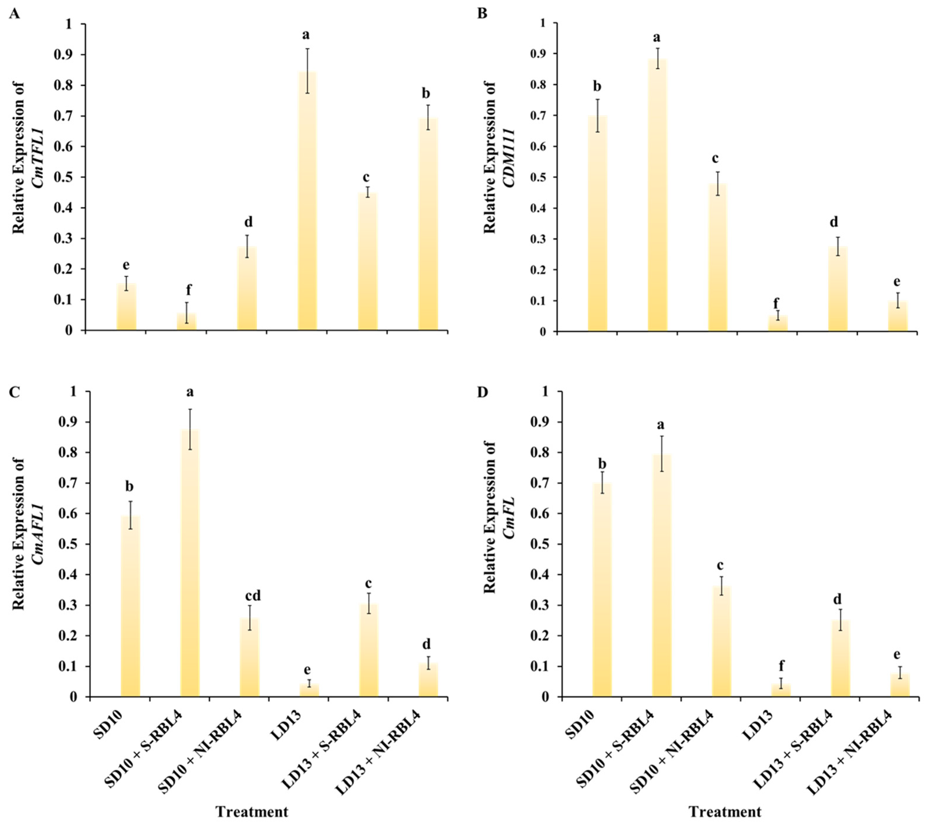 - Li, T.; Niki, T.; Nishijima, T.; Douzono, M.; Koshioka, M.; Hisamatsu, T. Roles of CmFL, CmAFL1, and CmSOC1 in the transition from vegetative to reproductive growth in Chrysanthemum morifolium Ramat. J. Hortic. Sci. Biotechnol. 2009, 84, 447–453. [Google Scholar] [CrossRef]