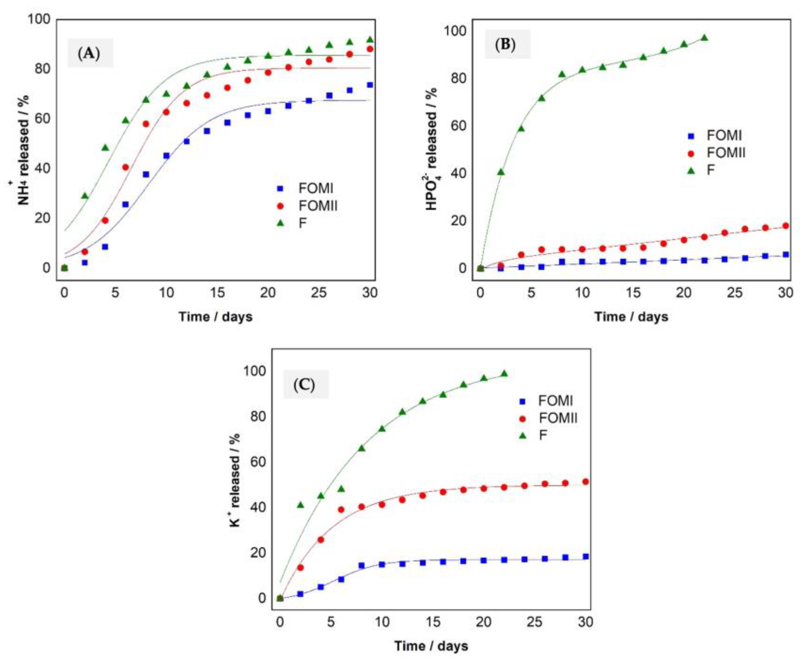 - FOMII released ≈50% N and >35% K in the first hour; P release was similar to FOMI early on but accelerated thereafter.