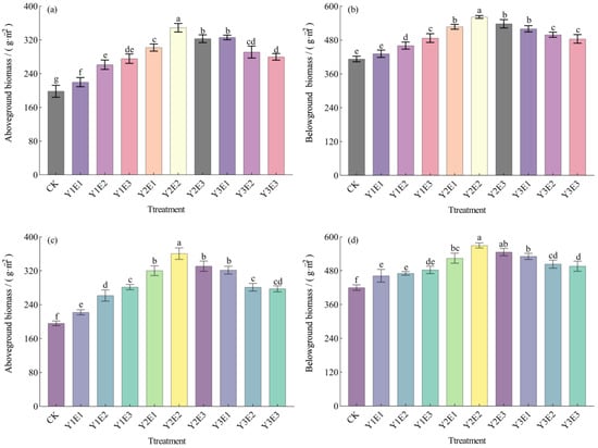 As shown in Figure 1, fertilization treatments significantly influenced both aboveground and belowground biomass production in the artificial grassland during the 2023–2024 study period. For aboveground biomass (Figure 1a,c), the control treatment (CK) consistently yielded the lowest values, demonstrating significant differences from all co-application treatments (p < 0.05). The Y2E2 treatment achieved the highest aboveground biomass, measuring 349.00 g·m−2 in 2023 (75.97% increase over CK) and 360.67 g·m−2 in 2024 (68.88% increase over CK), with both values being significantly superior to other treatments (p < 0.05).