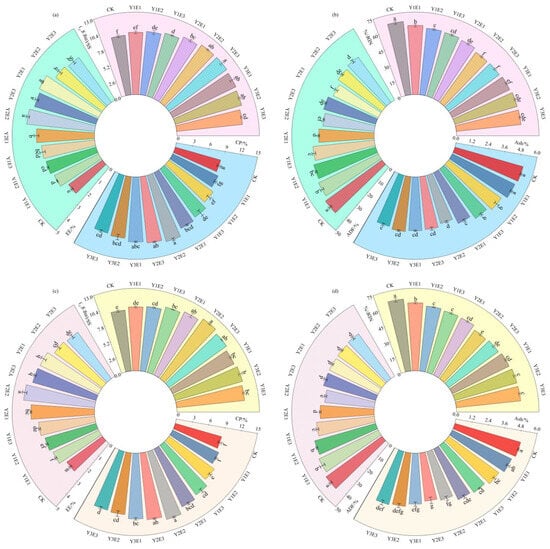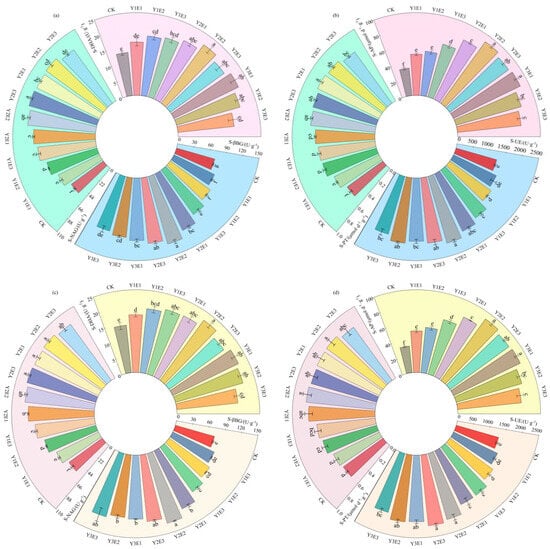 As shown in Figure 3a,b, soil β-glucosidase and dehydrogenase activities reached their highest levels under the Y2E2 treatment, measuring 127.66 U·g−1 and 21.87 U·g−1, respectively, representing significant increases of 77.15% and 66.61% compared to the control (CK) treatment (p < 0.05). Soil N-acetyl-glucosaminidase activity ranged from 52.70 to 94.09 U·g−1, with the highest activity observed in the Y2E3 treatment, followed by Y3E2, both showing significant increases of 78.52% and 78.51%, respectively, compared to CK (p < 0.05). Soil urease and acid phosphatase activities ranged from 1275.27 to 2098.15 U·g−1 and 33.35 to 91.83 μmol·d−1·g−1, respectively, with both enzymes exhibiting peak activity under the Y2E2 treatment, significantly higher than CK (p < 0.05). Soil protease (S-PT) activity was highest in the Y3E1 treatment (0.83 μmol·d−1·g−1), reflecting a 55.00% significant increase over CK (p < 0.05).