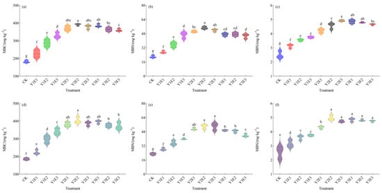 Effects of different fertilization treatments on soil microbial biomass carbon (MBC), nitrogen (MBN), and phosphorus (MBP) in artificial grasslands. Panels (a–c) present the 2023 analyses, while panels (d–f) display the 2024 results. MBC: soil microbial biomass carbon; MBN: soil microbial biomass nitrogen; MBP: soil microbial biomass phosphorus. Lowercase letters (e.g., “a”, “b”) denote statistically significant differences among treatments at p < 0.05 according to Duncan’s multiple range test.