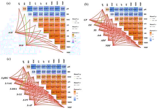 Correlation analyses of forage yield quality, soil physicochemical properties, and soil enzyme activities under different fertilization treatments. (a) Correlations between aboveground biomass and belowground biomass of artificial grassland with soil physicochemical properties and microbial biomass. (b) Correlations between forage nutritional quality indicators and soil physicochemical properties with microbial biomass. (c) Correlations between soil enzyme activities and soil physicochemical properties with microbial biomass. AGB: aboveground biomass; BGB: belowground biomass; pH: soil pH; BD: soil bulk density; SOC: soil organic carbon content; AN: alkali-hydrolyzable nitrogen content; AP: available phosphorus content; AK: available potassium content; MBC: soil microbial biomass carbon; MBN: soil microbial biomass nitrogen; MBP: soil microbial biomass phosphorus; CP: crude protein; EE: ether extract; SS: soluble sugars; Ash: crude ash; ADF: acid detergent fiber; NDF: neutral detergent fiber; S-βBG: soil β-glucosidase; S-DHA: soil dehydrogenase; S-NAG: soil N-acetyl-β-D-glucosaminidase; S-UE: soil urease; S-PT: soil protease; S-AP: soil acid phosphatase. Statistical significance levels: * p < 0.05, ** p < 0.01, *** p < 0.001.