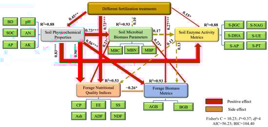 Structural equation model (SEM) analyzing the effects of different fertilization treatments on soil physicochemical properties, microbial biomass, enzyme activities, and forage yield/quality parameters. Significant path coefficients (p < 0.05) are indicated by solid lines, while non-significant relationships are shown as dashed lines. Red and orange arrows denote positive and negative correlations, respectively. Numbers adjacent to paths represent standardized coefficients (β), with arrow widths scaled proportionally to effect sizes. AGB: aboveground biomass; BGB: belowground biomass; pH: soil pH; BD: soil bulk density; SOC: soil organic carbon content; AN: alkali-hydrolyzable nitrogen content; AP: available phosphorus content; AK: available potassium content; MBC: soil microbial biomass carbon; MBN: soil microbial biomass nitrogen; MBP: soil microbial biomass phosphorus; CP: crude protein; EE: ether extract; SS: soluble sugars; Ash: crude ash; ADF: acid detergent fiber; NDF: neutral detergent fiber; S-βBG: soil β-glucosidase; S-DHA: soil dehydrogenase; S-NAG: soil N-acetyl-β-D-glucosaminidase; S-UE: soil urease; S-PT: soil protease; S-AP: soil acid phosphatase. Statistical significance levels: * p < 0.05, ** p < 0.01, *** p < 0.001.