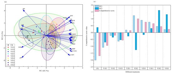 Principal component analysis effectively reduced the dimensionality of 23 measured parameters—encompassing yield quality traits, soil physicochemical properties, microbial biomass, and soil enzyme activities—into two orthogonal principal components (Figure 7a), with a cumulative variance explanation rate of 88.90% (Figure 7a). The first principal component (PC1) exhibited an eigenvalue of 19.71, accounting for 85.70% of total data variation, while PC2 contributed an additional 3.20% variance, confirming systematic interrelationships among indicators.