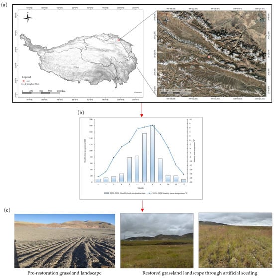 Geographic location, experimental layout, and field photographs of the study site. (a) Geographic location map of the experimental site; (b) Monthly mean temperature and total precipitation at the experimental site from 2020 to 2024 (meteorological data obtained from the Tianjun National Meteorological Station); (c) Field photograph of experimental plots.