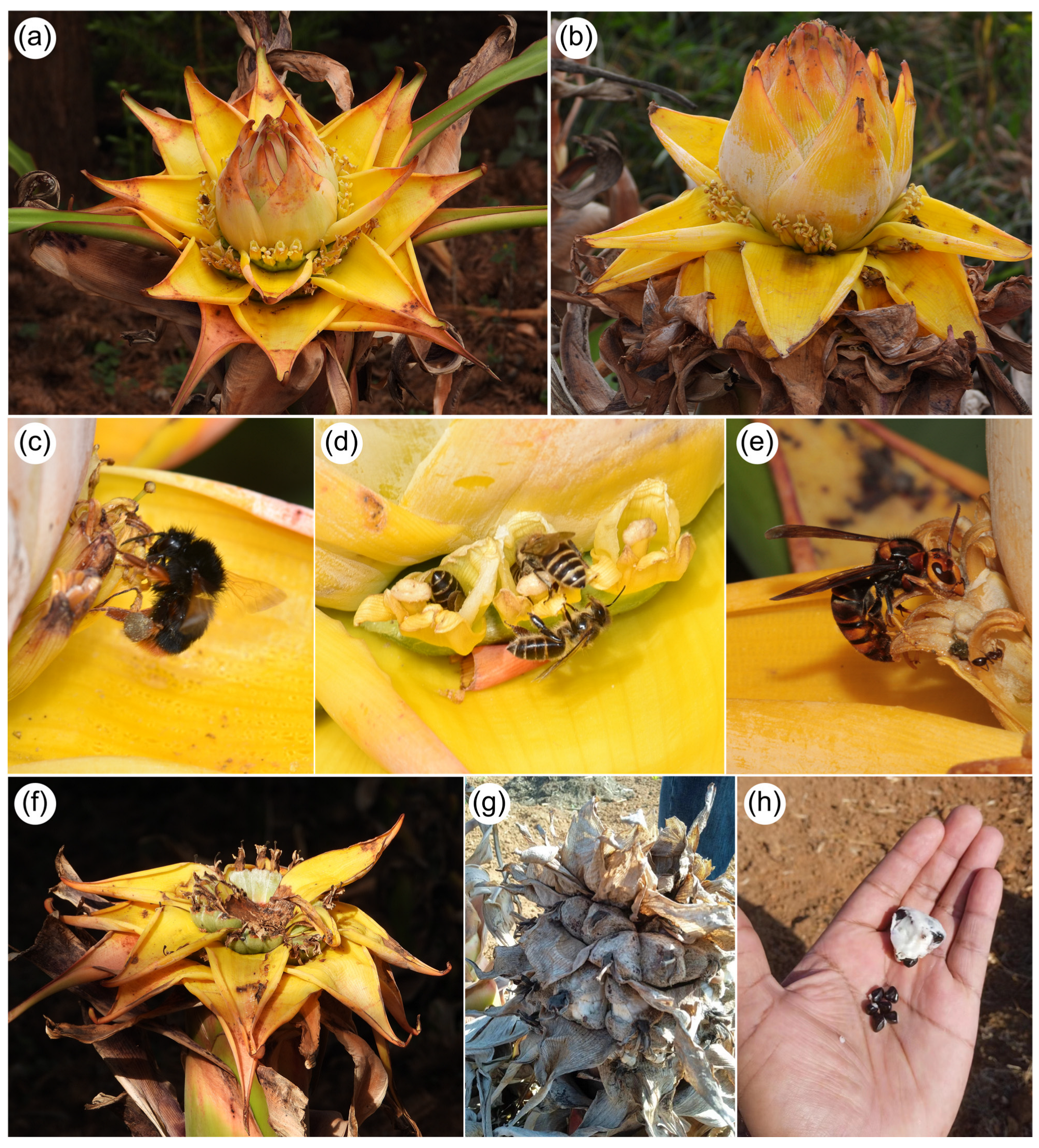 - Nur, N. Studies on pollination in Musaceae. Ann. Bot. 1976, 40, 167–177. [Google Scholar] [CrossRef]