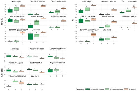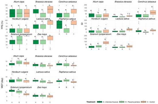 Germination response of species to foliar lixiviates of Artemisia thuscula and Plocama pendula compared with the untreated controls under greenhouse conditions. Final Percentage of Germination (FPG, %), the Germination Index (GI), and Mean Germination Time (MGT, days) are displayed as boxplots (left to right, top to bottom). Boxplots represent the median, 25th, and 75th percentiles and the range of nearby values; dots indicate outliers. Different letters above the boxes indicate significant differences between treatments (p < 0.05).