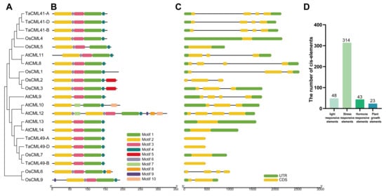 Phylogenetic relationships, conserved motifs, gene structures, and cis-elements of subgroup II CaM/CMLs in wheat, rice, and Arabidopsis. (A) A maximum-likelihood (ML) phylogenetic tree of CaM/CML proteins from wheat (Ta), rice (Os), and Arabidopsis (At) constructed using MEGA X with 1000 bootstrap replicates. (B) Conserved motif distributions of 21 CaM/CMLs. (C) Gene structures of 21 CaM/CMLs. (D) Predicted cis-elements in promoter regions analyzed using the PlantCARE database.