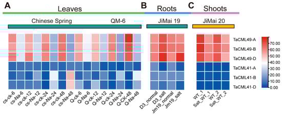 The expression data of TaCML41 and TaCML49 gene in leaves and roots after salt stress were downloaded from the abiotic stress transcriptome. The abiotic stress transcriptome data can be searched from the NCBI website (https://www.ncbi.nml.nih.gov, accessed on 3 August 2025). TBtools software is then used to visualize the data obtained above [42].