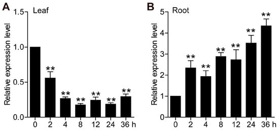 The expression patterns of TaCML49-B under salt stress were examined using qRT-PCR. Samples from leaves and roots were collected at 0 h, 2 h, 4 h, 8 h, 12 h, 24 h, and 36 h after salt treatment. In leaves, the transcript levels of TaCML49-B decreased significantly under salt stress (Figure 3A), whereas the levels were markedly upregulated in roots (Figure 3B). These quantitative results were consistent with the transcriptome data, confirming that TaCML49-B is involved in salt stress response.