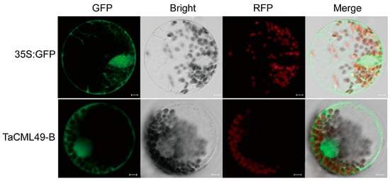 Subcellular localization of TaCML49-B. The p16318hGFP (control) and TaCML49-B-GFP recombinant were transiently expressed in wheat protoplasts The green indicates GFP signals, and the red indicates chloroplast autofluorescence. Results were observed after transformation for 18 h with confocal microscopy. Scale bars = 5 mm.