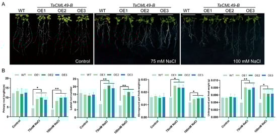 Phenotypic analysis of TaCML49-B transgenic Arabidopsis under salt stress. (A) Root length assays of WT and TaCML49-B OE lines on MS medium and MS medium supplemented with 75 mM or 100 mM NaCl. (B) The primary root length, lateral root number, shoot fresh weight, and root fresh weight of WT and OE lines. Five-day-old seedlings were transferred to the indicated media and grown for 7 days. Data represent mean ± SD from three biological replicates. Significant differences were determined by Student’s t-test (* p < 0.05, ** p < 0.01).