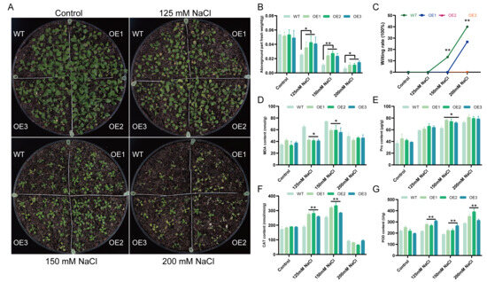 In the phenotypic observation experiment, seeds of WT and transgenic Arabidopsis plants were seeded into flowerpots and salt-stress tests were carried out when they were 3 weeks old. The flowerpots were watered with different concentrations of NaCl solution (125 mM, 150 mM, and 200 mM NaCl). After 7 days of salt treatment, the phenotypes were observed, and the wilting rate and fresh weight of above-ground parts were calculated. The contents of MDA, PRO, CAT, and POD in transgenic Arabidopsis seedlings treated with salt solution at different concentrations were detected with the physiological index assay kit (Suzhou Comin Biotechnology, Suzhou, China). The test was carried out according to the determination method in the kit instructions, and three biological replicates were performed for each experiment.
