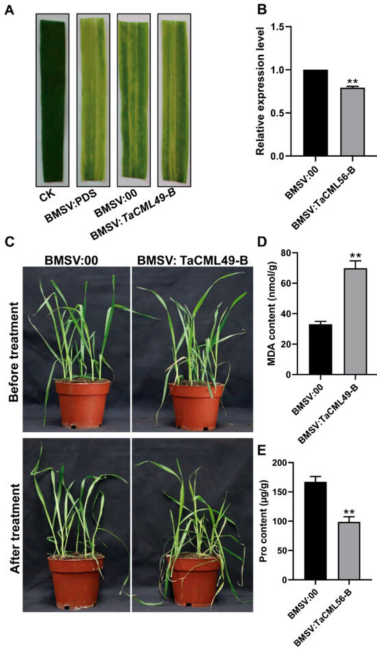 Functional analysis of wheat TaCML49-B using BSMV-VIGS. (A) Phenotypes of wheat plants following BSMV-VIGS infection. (B) qRT-PCR analysis of TaCML49-B expression in plants infected with BSMV: TaCML49-B or BSMV:00 (control). (C) Phenotypic response of BSMV: TaCML49-B and control plants under salt stress. (D,E) Physiological parameters including MDA and Pro contents in BSMV: TaCML49-B and control plants under salt stress. Data represent mean ± SD from three biological replicates. Significant differences were determined by Student’s t-test (** p < 0.01).