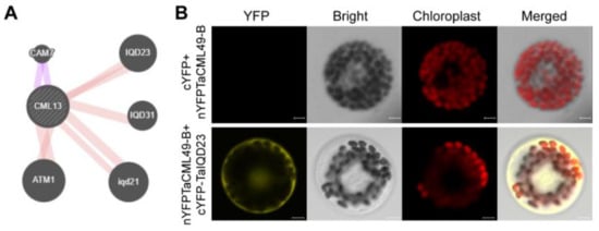 To predict potential protein interactions, the STRING web server was used. The analysis suggested a possible interaction between TaCML49-B and TaIQD23 (Figure 8A). To further validate this interaction, BiFC assay was performed. TaCML49-B fused to the N-terminal half of YFP (nYFP) and TaIQD23 fused to the C-terminal half of YFP (cYFP) were transiently co-expressed in wheat protoplasts. Yellow fluorescence signals were detected, confirming TaCML49-B interacted with TaIQD23 (Figure 8B).