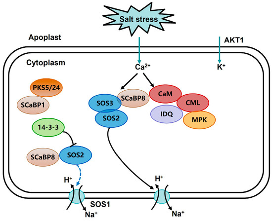 Schematic diagram of salt-stress response, including CML regulation.
