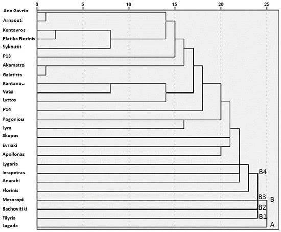 The hierarchical cluster analysis conducted generated a dendrogram that revealed distinct grouping patterns among the 25 traditional pepper (Capsicum annuum L.) genotypes (Figure 2). Based on the rescaled distance cluster combine values, two primary clusters, A and B, were identified, reflecting the considerable phenotypic variability present within the studied germplasm. Cluster A consisted of a single landrace, ‘Lagada’, which was clearly differentiated from all others, likely due to its unique morphological or nutritional characteristics. Cluster B encompassed the remaining 24 genotypes and was further subdivided into four sub-clusters: sub-cluster B1 consisted solely of ‘Filyria’, sub-cluster B2 included only ‘Bachovitiki’, sub-cluster B3 was represented by ‘Mesoropi’ and sub-cluster B4 included all other genotypes grouped under this broader cluster. Despite the overall phenotypic diversity, the dendrogram also highlighted several pairs of genotypes that clustered at very short linkage distances, indicating high levels of similarity or possible genetic relatedness. Specifically, ‘Ano Gavrio’ and ‘Arnaouti’ appeared nearly indistinguishable, suggesting strong morphological or agronomic resemblance, which may be attributed to their common insular origin, as both landraces derive from Aegean islands. Similarly, ‘Kentavros’ and ‘Platika Florinis’ formed a closely related pair, as did ‘Akamatra’ and ‘Galatista’, potentially reflecting common ancestry, geographic proximity, or parallel farmer selection histories. These clustering patterns underscore the rich phenotypic structure within the collection and may inform targeted conservation strategies or the rational selection of parental lines for breeding programs aimed at enhancing pepper adaptation and fruit quality under diverse environmental conditions.
