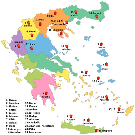 Geographic distribution of the evaluated pepper (C. annuum L.) genotypes across Greece. The numbers correspond to collection sites for landraces or the responsible breeding institutes for commercial varieties (20, 21, 23, 24, 25).