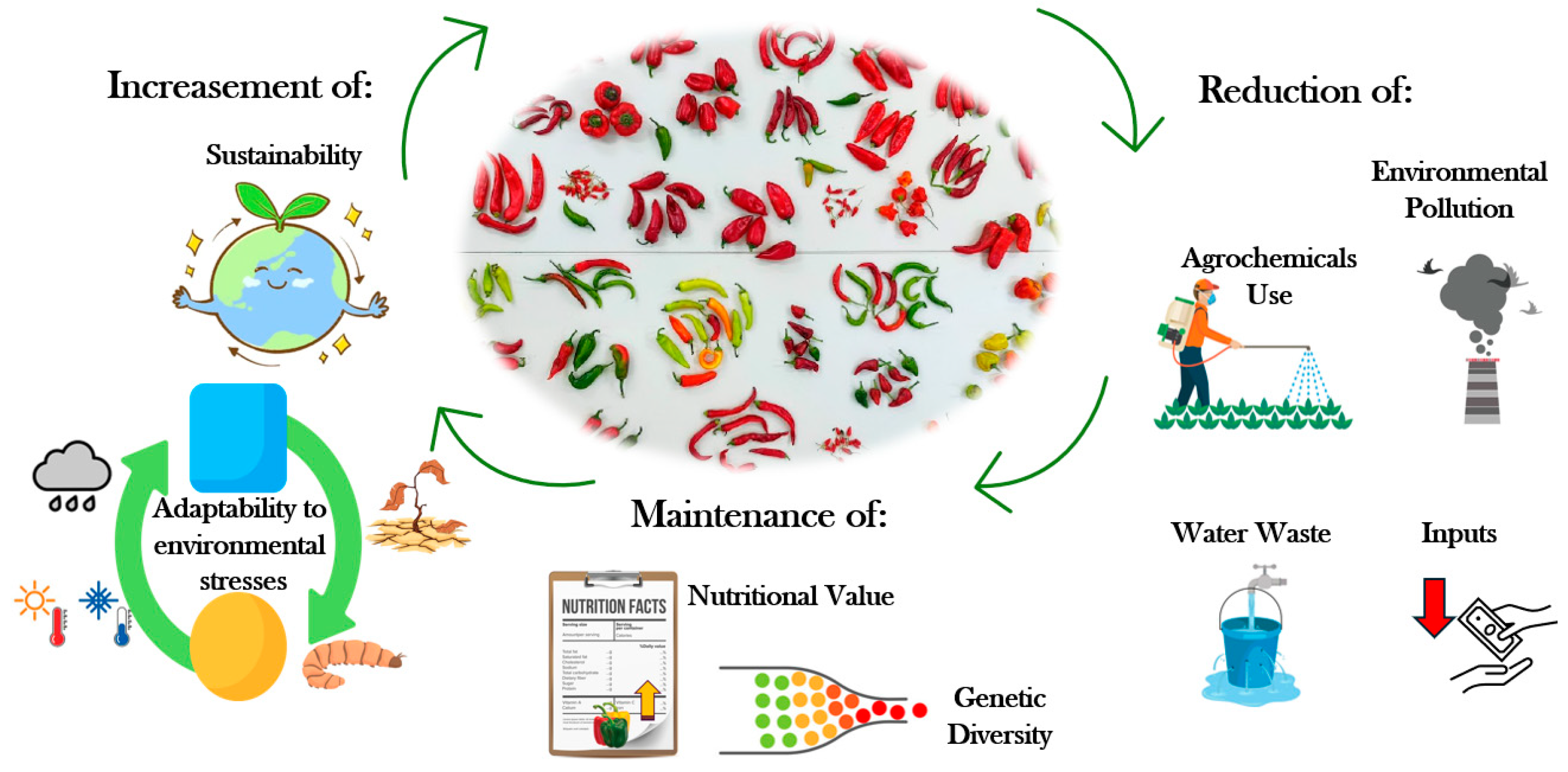 The present study evaluates twenty-five pepper genotypes, including nineteen landraces from the collection of the Greek Genebank (ELGO-DIMITRA), one conservation variety and five commercial varieties derived from local populations, under a low-input cultivation system, with a focus on evaluating physiological characteristics, yield performance, and fruit nutritional value. Given the high production costs and the potential yield limitations currently challenging agriculture globally, particularly in Greece, including pepper cultivation, identifying resilient genotypes that can thrive under low-input conditions is of critical importance. Traditional varieties, often better adapted to local agro-environmental conditions, represent a valuable reservoir of genetic diversity that can support more sustainable and climate-resilient production systems. Their preservation and utilization not only enhance agrobiodiversity but also contribute to the promotion of locally adapted, high-quality produce with added economic and gastronomic value (Figure 1).