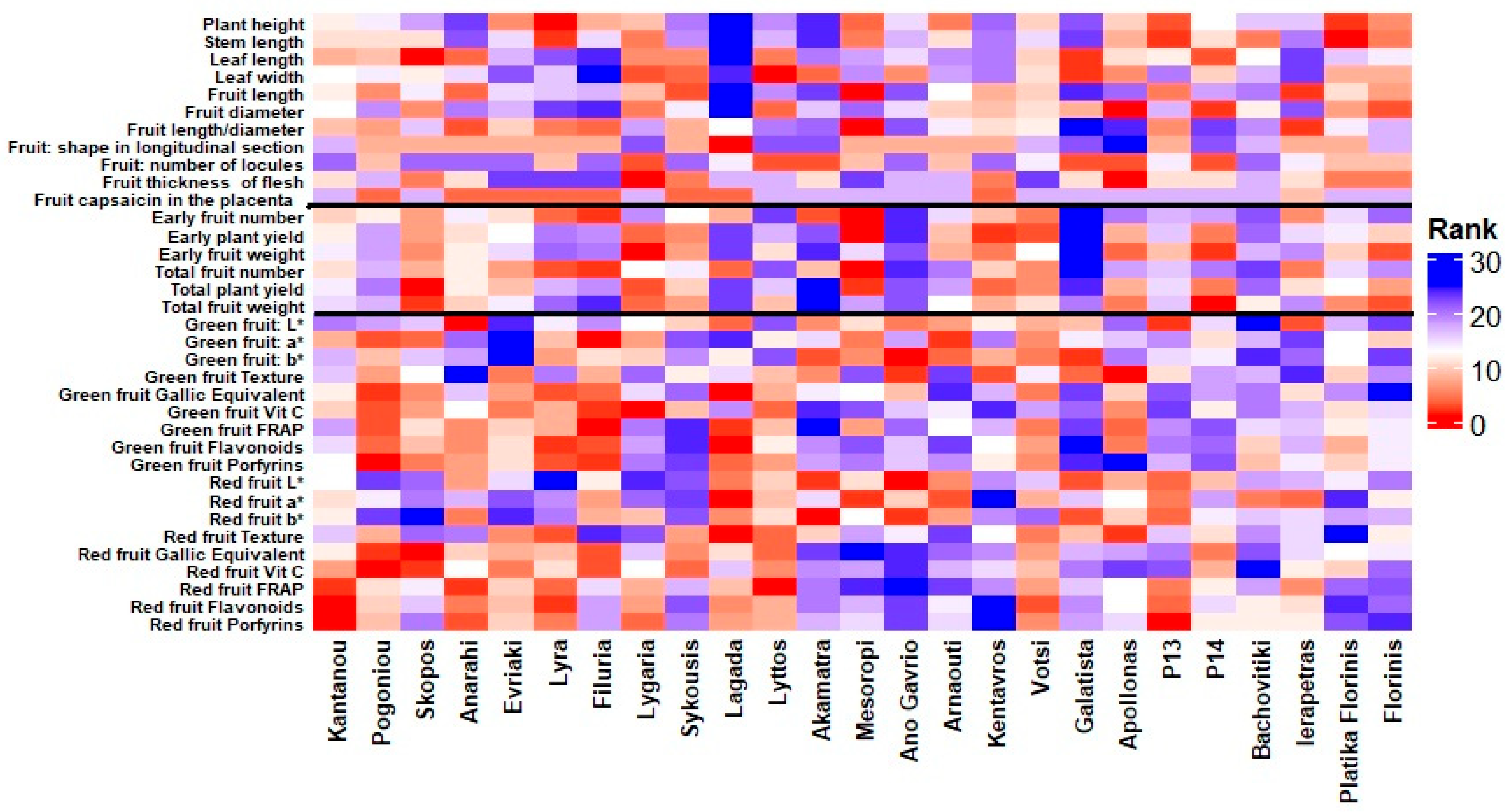 The heatmap in Figure 3 illustrates the ranking patterns of the 25 pepper entries across a comprehensive set of evaluated traits. The vertical black lines divide the traits into three main categories: morphological characteristics (left section), yield-related traits (middle section), and fruit quality and nutritional value traits (right section). Warmer colors (red shades) indicate higher ranking performance for the respective traits, whereas cooler colors (blue shades) indicate lower rankings. The visualization highlights the considerable variation among entries, with some genotypes, such as ‘Pogoniou’, ‘Filuria’ and ‘Lagada’, consistently ranking high in several fruit quality and nutritional parameters, while others, like ‘Mesoropi’, ‘Lygaria’, and ‘Apollonas’ excel in certain yield-related or morphological traits. This pattern highlights the diverse performance profiles of the evaluated germplasm and the potential for targeted selection based on specific breeding objectives. However, suppose we aim to estimate the overall ranking of the tested genotypes. In that case, the heatmap analysis indicates that the landraces ‘Pogoniou’, ‘Filuria’, ‘Lyra’, ‘Lagada’, and ‘Lygaria’, consistently ranked among the top performers across all the measured traits, highlighting their potential as promising candidates for breeding and low-input cultivation systems.
