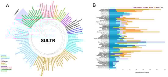 To explore the evolutionary relationships within the SULTR family, a phylogenetic tree was constructed using the neighbor-joining (NJ) method based on multiple sequence alignments of SULTR sequences from representative plant species obtained from the public databases, indicating that SULTR might evolve from Chromista (Figure 1A). In the 53 investigated plant species, a total of 859 SULTR family members were detected. The amount of SULTR genes varied across plant species, with the angiosperms having about 3–8 times of SULTR genes than algae (Figure 1B). Furthermore, 15%, 27%, and 15% of the SULTR genes exhibited tandem, block, and duplication, respectively (https://bioinformatics.psb.ugent.be/plaza/versions/plaza_v5_monocots/gene_families/view/HOM05M000293 accessed on 4 July 2025). These results indicate that the SULTR family underwent a potential evolutionary expansion, which led to the evolutionary divergence and functional differentiation of SULTR genes in green plants.