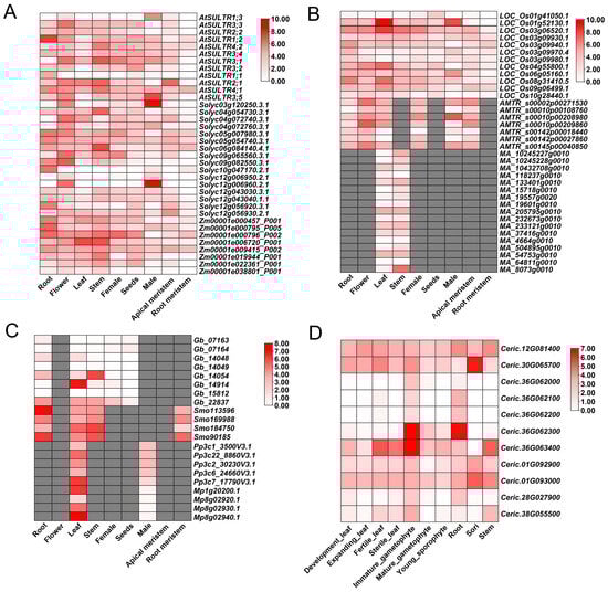 Comparative expression of SULTR genes across tissues and plant lineages. (A) Eudicot and maize panel: Arabidopsis thaliana (At), Solanum lycopersicum (Solyc), and Zea mays (Zm). (B) Monocot and basal angiosperm panel: Oryza sativa (LOC_Os), Musa acuminata (MA), and Amborella trichopoda (AMTR). (C) Gymnosperm and early-diverging land plants: Ginkgo biloba (Gb), lycophyte Selaginella moellendorffii (Smo), moss Physcomitrium patens (Pp), and liverwort Marchantia polymorpha (Mp). (D) Fern: Ceratopteris richardii (Ceric). Heatmaps show expression (log-scaled) across male, female, apical meristem, root meristem, flower, seed, root, leaf, and stem (or the closest available homologous tissues per species). White implying low expression while red implying high expression, and missing data set as gray.