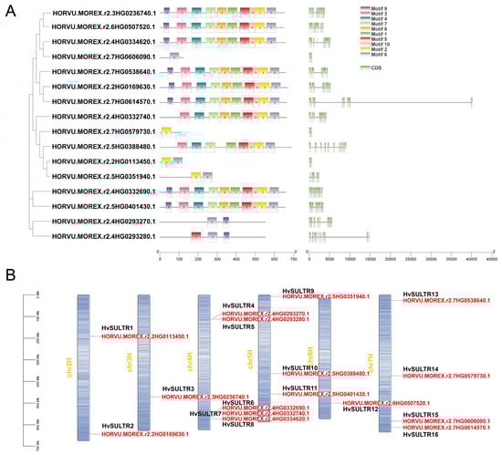 Gene structure and motif (A) and chromosomal location (B) of HvSULTRs. Genes were named according to the order of chromosome location, e.g., HORVU.MOREX.r2.2HG0113450.1 named HvSULTR1. The figures were visualized using Tbtools (Tbtools.v2.056).