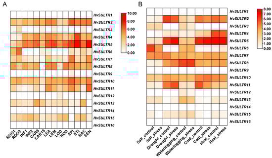 Gene expression analysis of HvSULTR in diverse tissues (A) and stress conditions (B). Data were downloaded from a public database (https://apex.ipk-gatersleben.de/apex/f?p=284:10 and http://barleyexp.com/, accessed on 15 March 2025). White implying low expression and red implying high expression.