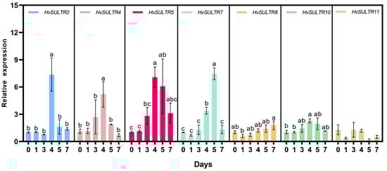 The importance of HvSULTRs in barley’s adaptive response to abiotic stresses was further investigated by quantifying the expression levels of seven HvSULTR members upon heat stress (Figure 5). Our results show that these HvSULTRs (except HvSULTR11) were all induced by heat stress. Still, they exhibited different response trends with the exposure time. For instance, HvSULTR2, HvSULTR4, HvSULTR5, and HvSULTR10 reached their highest expression levels on the fourth day of heat stress and then recovered to baseline. A similar trend was observed for HvSULTR7, with the peak value of its expression appearing on the fifth day. Notably, under heat stress treatment, the expression level of the HvSULTR8 gene was continuously upregulated, showing an expression pattern associated with heat stress response. Based on this gene expression-level result, it can be preliminarily inferred that such HvSULTR genes may be involved in regulating the adaptive response of barley to heat stress, but their specific functions require further verification in combination with protein activity assays. It was unexpected that the expression level of HvSULTR11 showed little change under heat stress, which suggests that this gene may have a distinct role in barley’s response to heat stress.