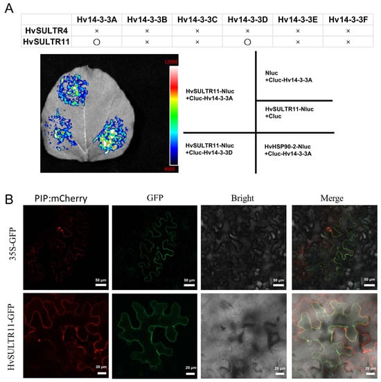 Hv14-3-3A positively regulates stress tolerance in barley []. Herein, the interaction between HvSULTR and Hv14-3-3s was examined using a luciferase complementation (LUC) assay. When Cluc-fused HvSULTR11 and Hv14-3-3A plasmids were co-expressed in tobacco leaves, a strong signal was observed, in contrast, no signal was detected in the negative control (Figure 6A). Similarly, an interaction between HvSULTR11 and Hv14-3-3D was also observed (Figure 6A). Still, no interactions were found between HvSULTR and other Hv14-3-3 proteins (Figure 6B). Additionally, no direct interaction was detected between HvSULTR4 and Hv14-3-3s (Figure 6B). Our results indicate that there are specific interactions between HvSULTR11 and Hv14-3-3A/D in barley.