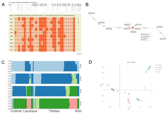 Haplotype of HvSULTR11 in cultivar, wild, landrace, and Tibetan barley. Gene haplotype in diverse barley (A), red representing T/C and light red representing A/G. Haplotype network relationship (B). Population genetic structure of different barley (C), the four small graphs represent population structure analysis based on different clustering numbers (K = 2 to K = 5), and the color blocks in each small image represent different genetic components or ancestral sources. Scatter plot of population genetic structure based on principal component analysis (PCA) (D). Data were downloaded from a public database (https://www.barleygvdb.cn/project/?pro=WGS&_rand=buu1q accessed on 8 July 2025).
