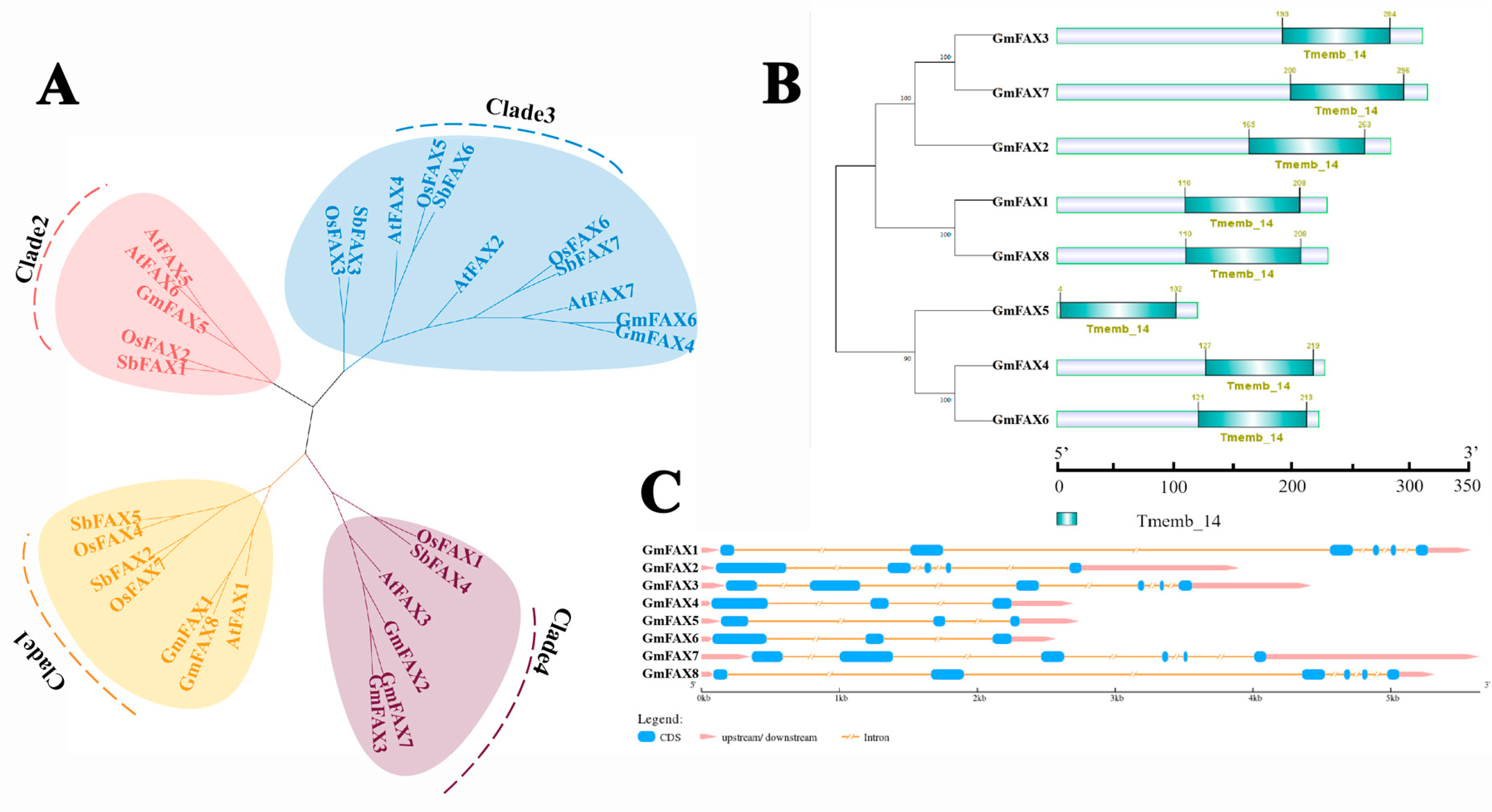 2.4. Expression Pattern of Soybean FAXs in Different Developmental Stages