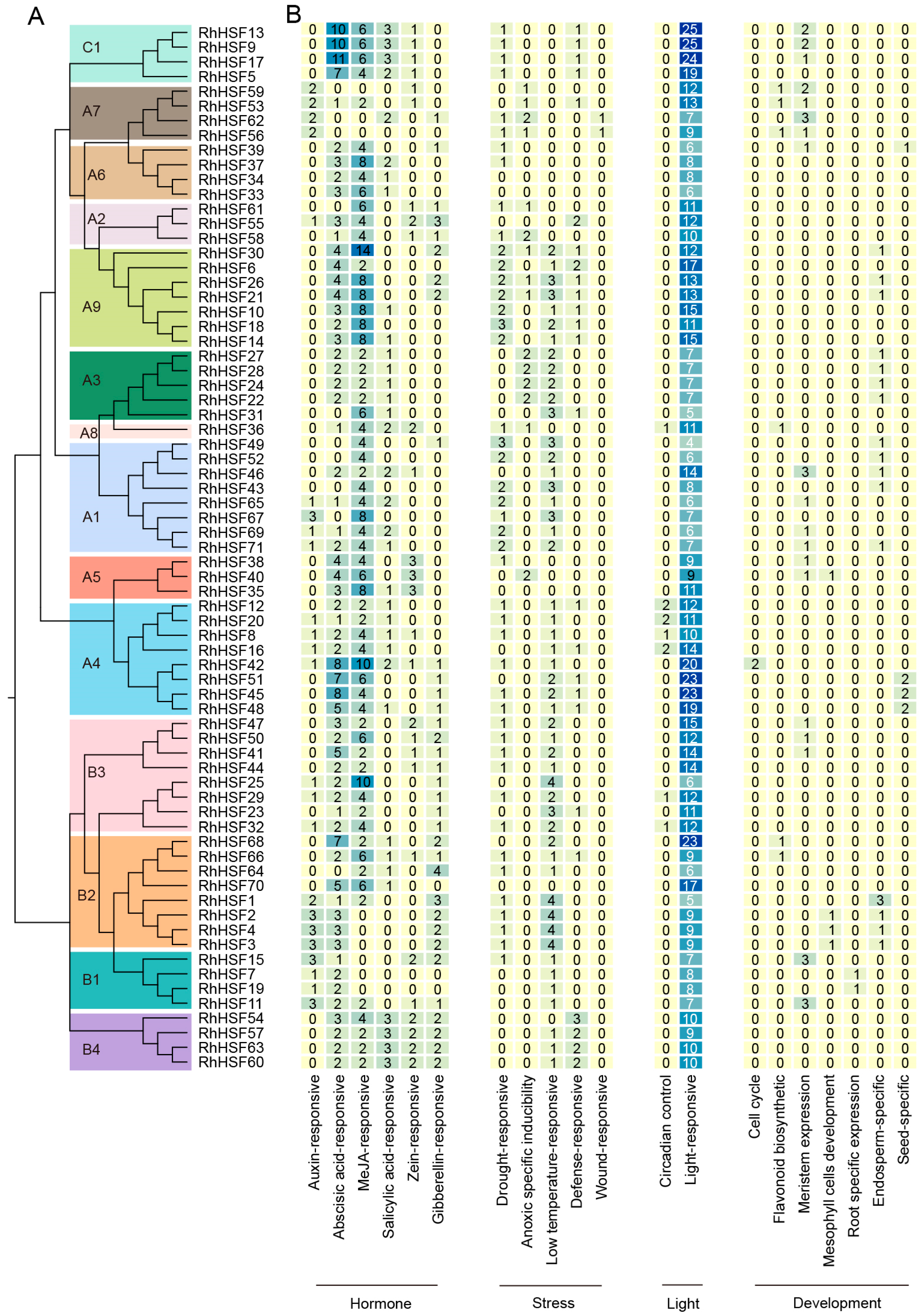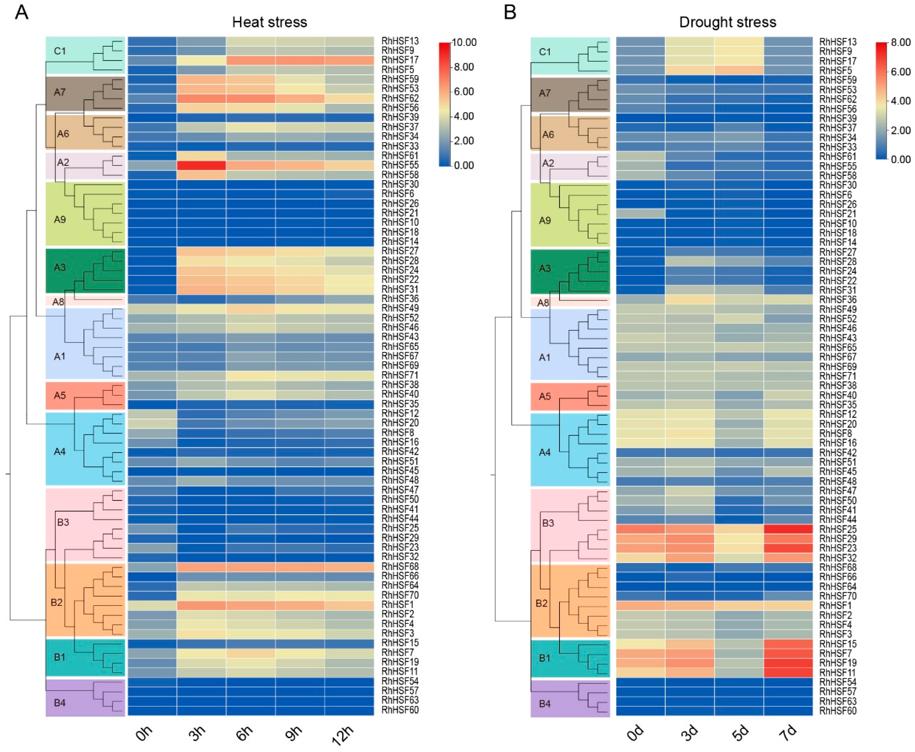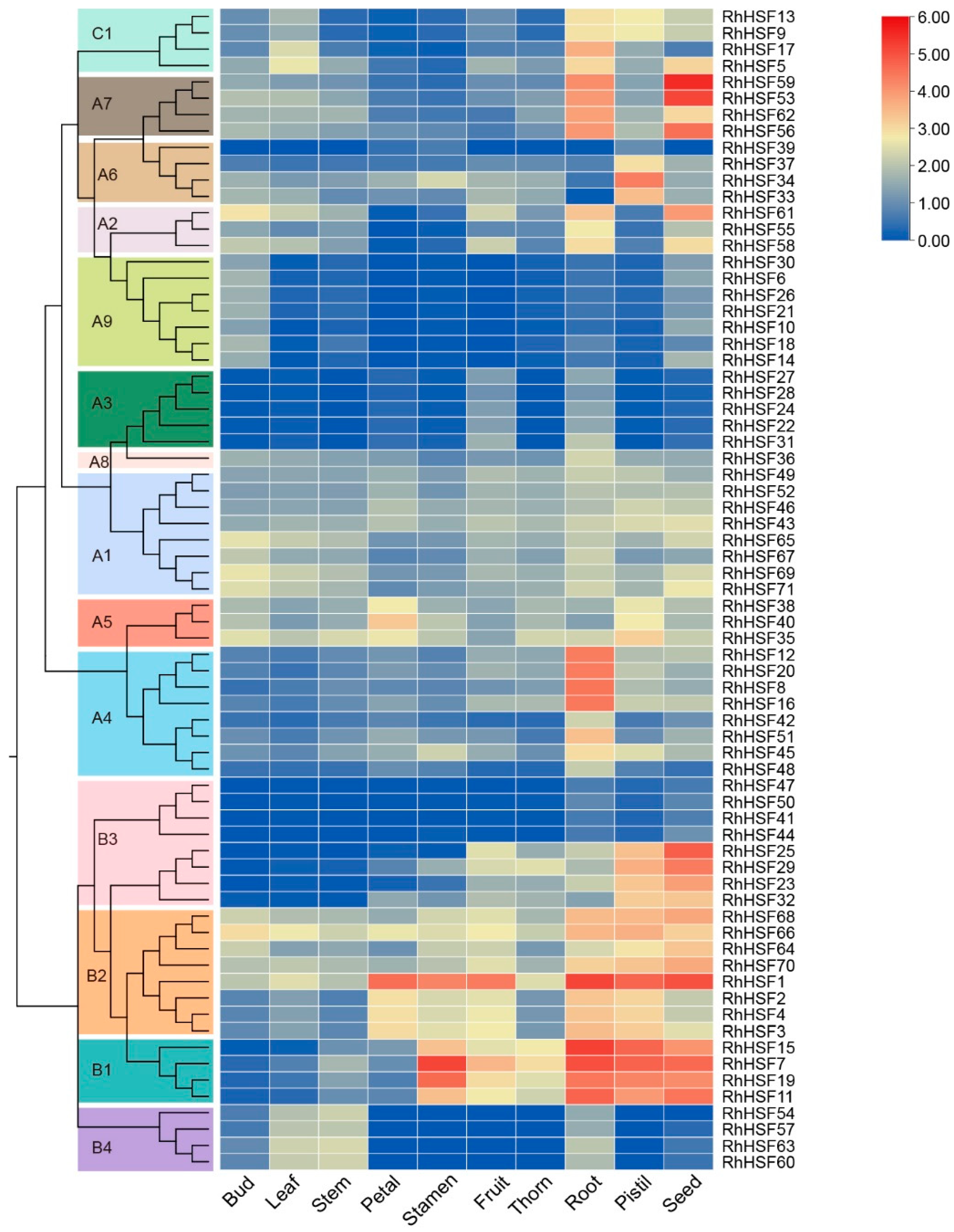 Zhu, J.; Fan, S.; Li, R.; Dong, F.; Liu, Y.; Wang, C. Genome-Wide Identification, Phylogenetic Classification, and Expression Profiling of the HSF Gene Family in Rosa hybrida Under Heat and Drought Stress. Plants 2025, 14, 3167. https://doi.org/10.3390/plants14203167