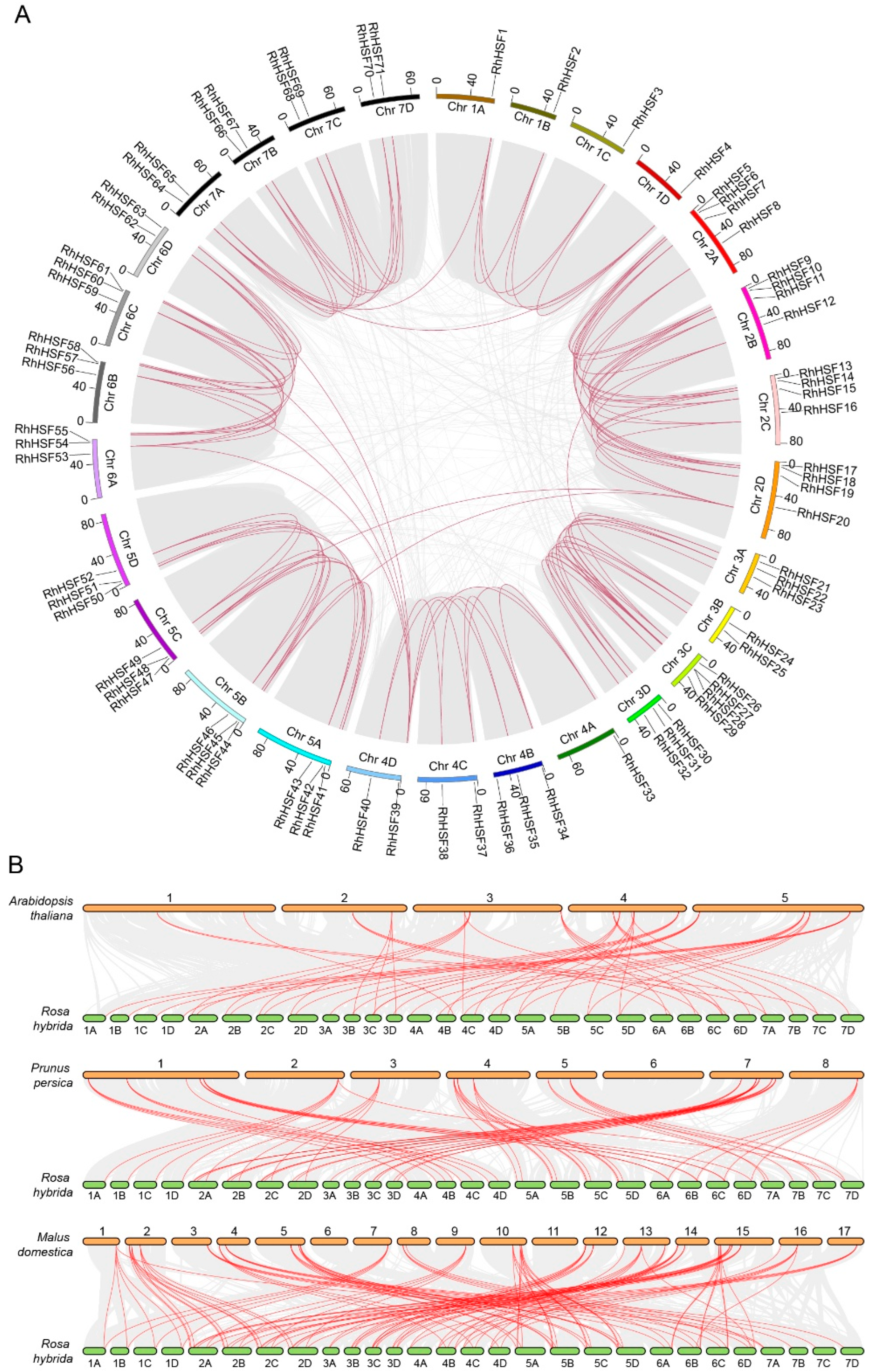 2.5. Chromosomal Distribution and Synteny Analysis of RhHSFs