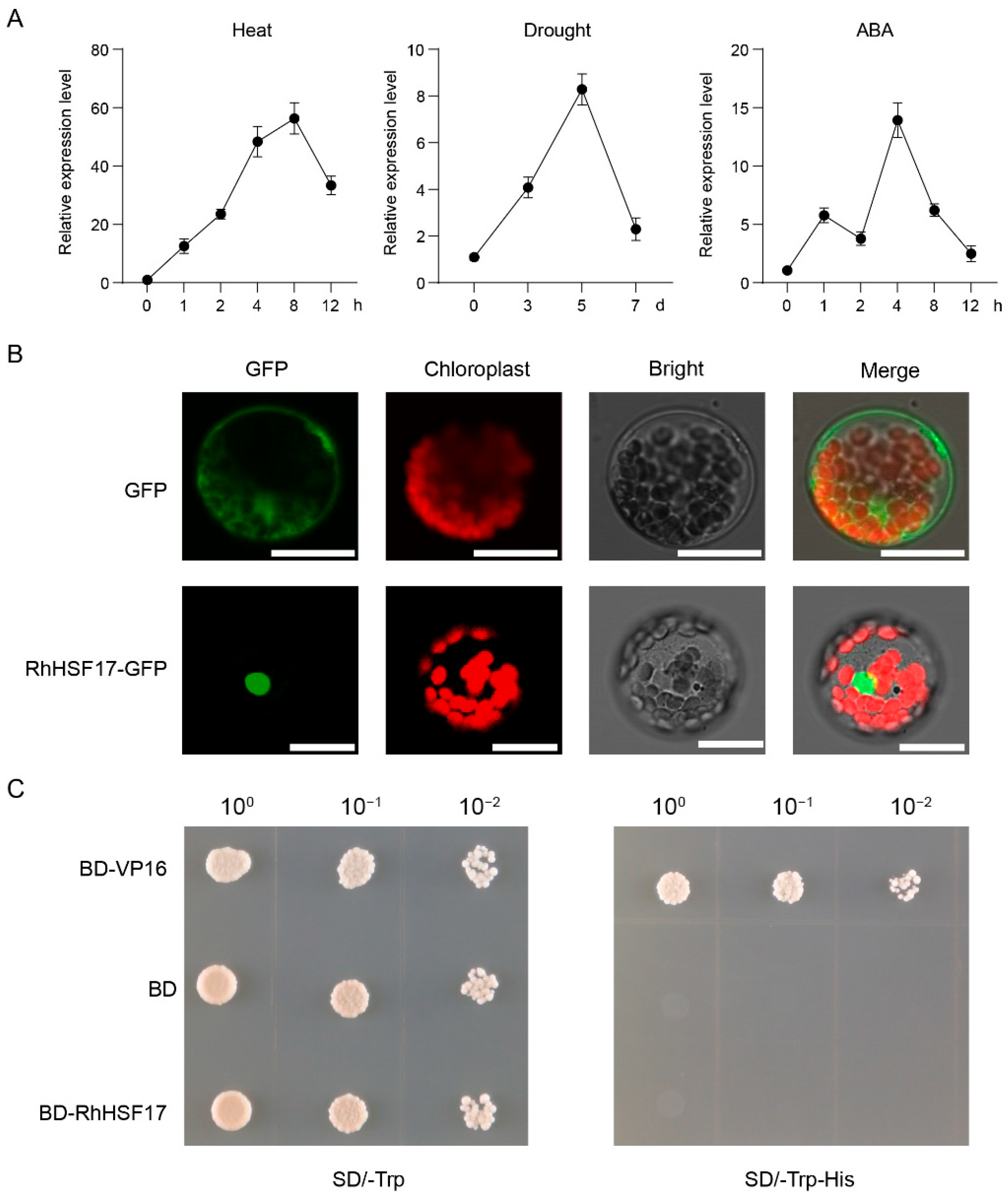 - Li, S.; Sun, Y.; Hu, Z.; Dong, F.; Zhu, J.; Cao, M.; Wang, C. Cloning and expression analysis of RhHsf24 gene in rose (Rosa hybrida). Sci. Rep. 2025, 15, 8182. [Google Scholar] [CrossRef]