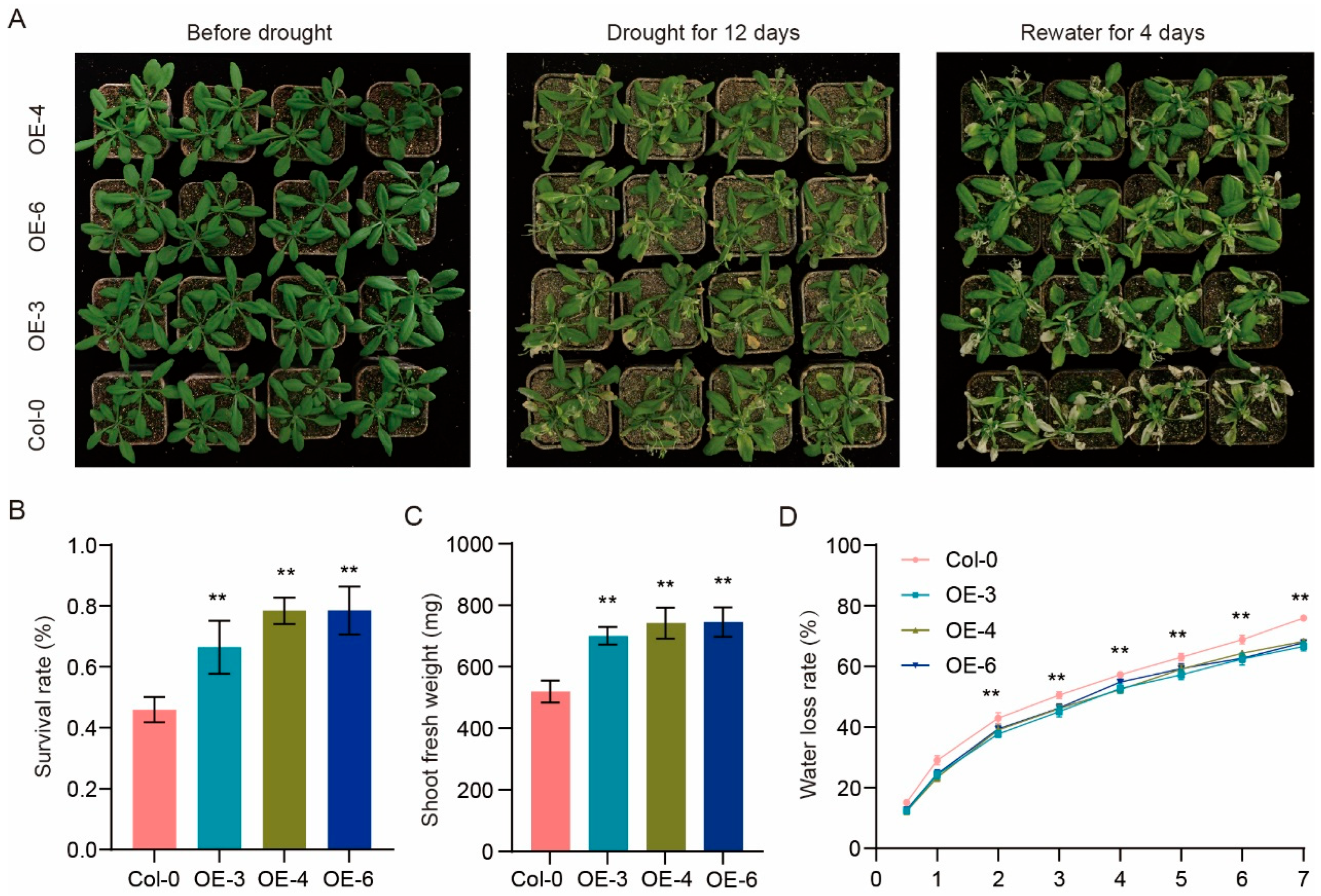 4.13. Drought Treatment at the Seedling Stage in Arabidopsis Transgenic Lines