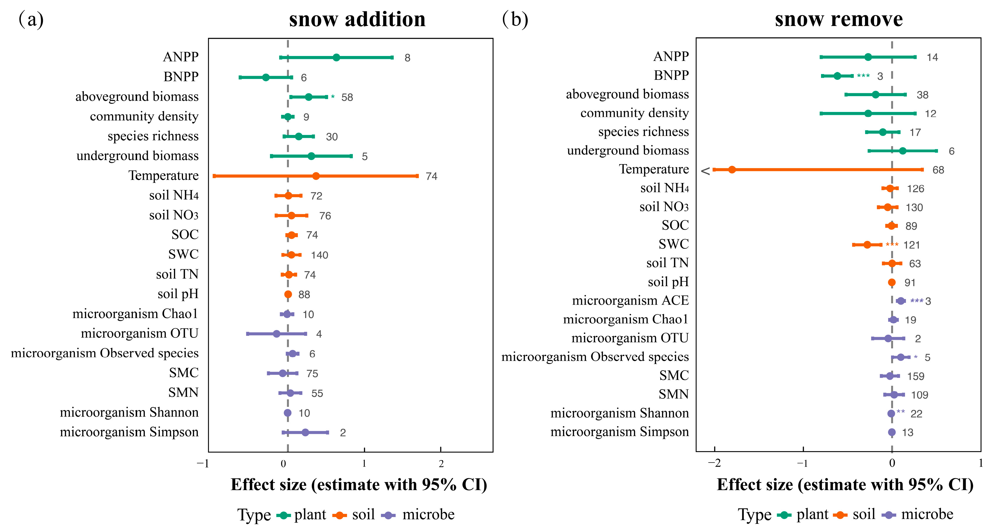 2.1. Overall Responses of Plants, Soils, and Microbes to Snow Cover Change